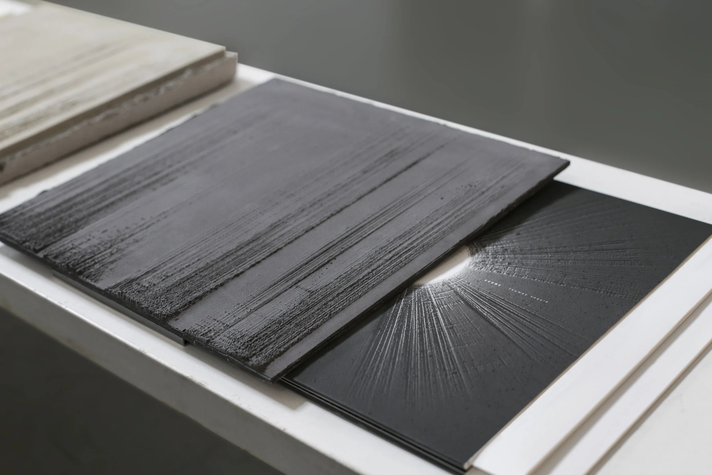 - 33cm x 33cm dark resin-cast plate, in relief. aluminium profiles for wall-mounting.